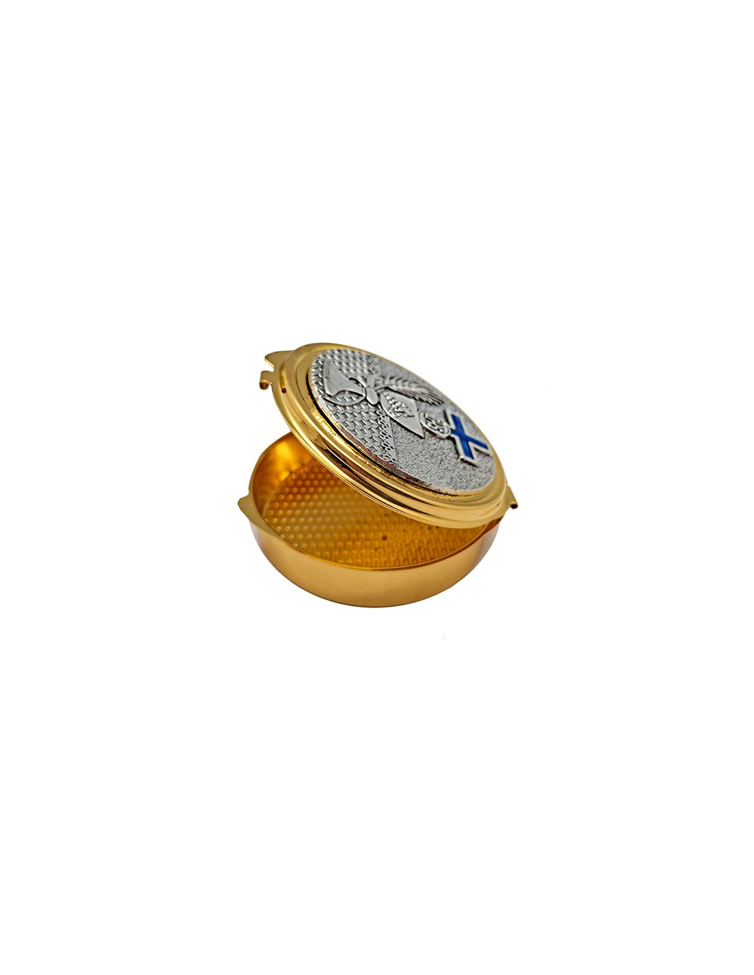 Portaviatico Caja Dorada Placa Relieve Plateada Caliz Con Cruz Esmaltada Azul 6.2X2 Cm