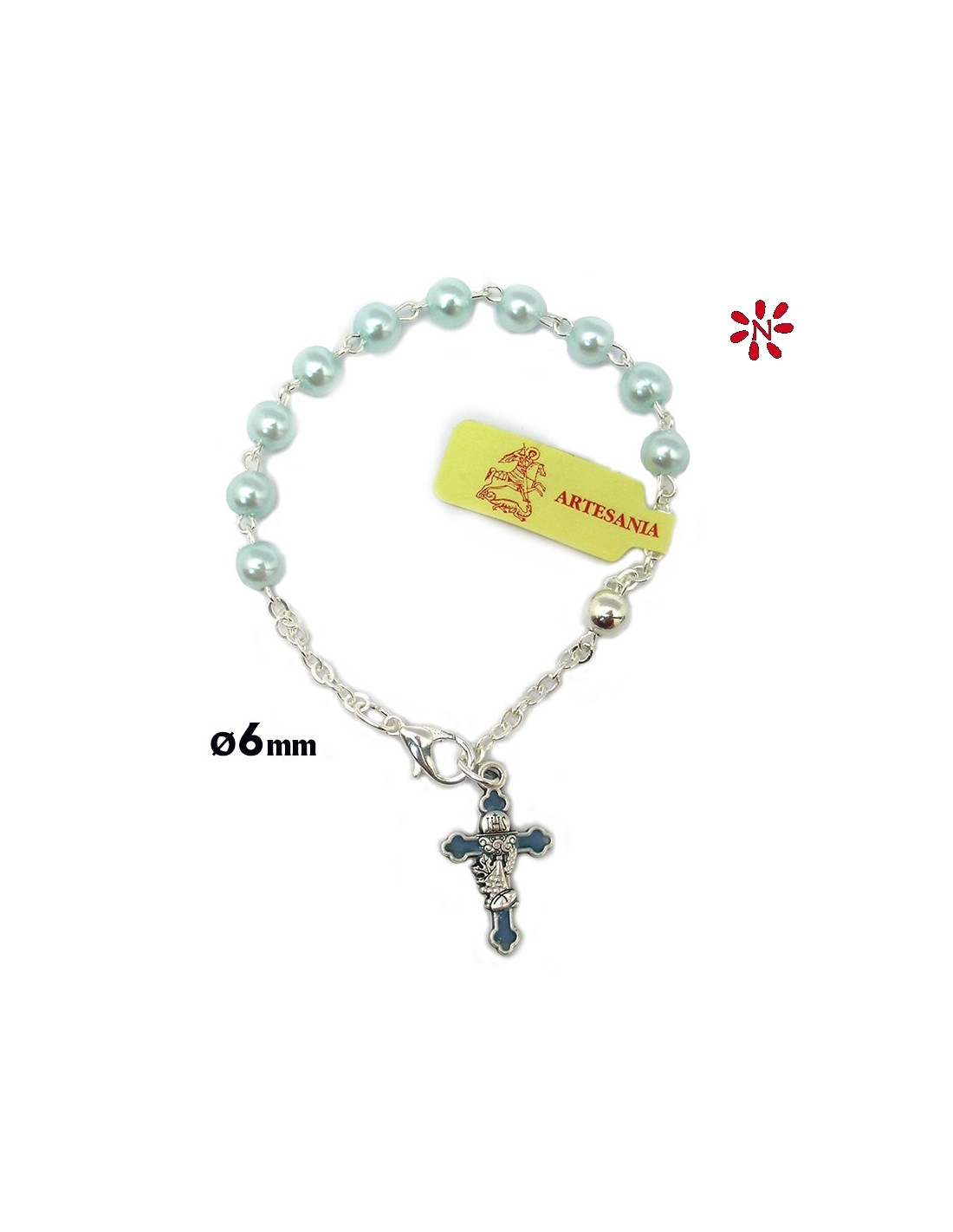 Brazalete Perla Celeste 6Mm Cruz Primera Comunion Esmaltada