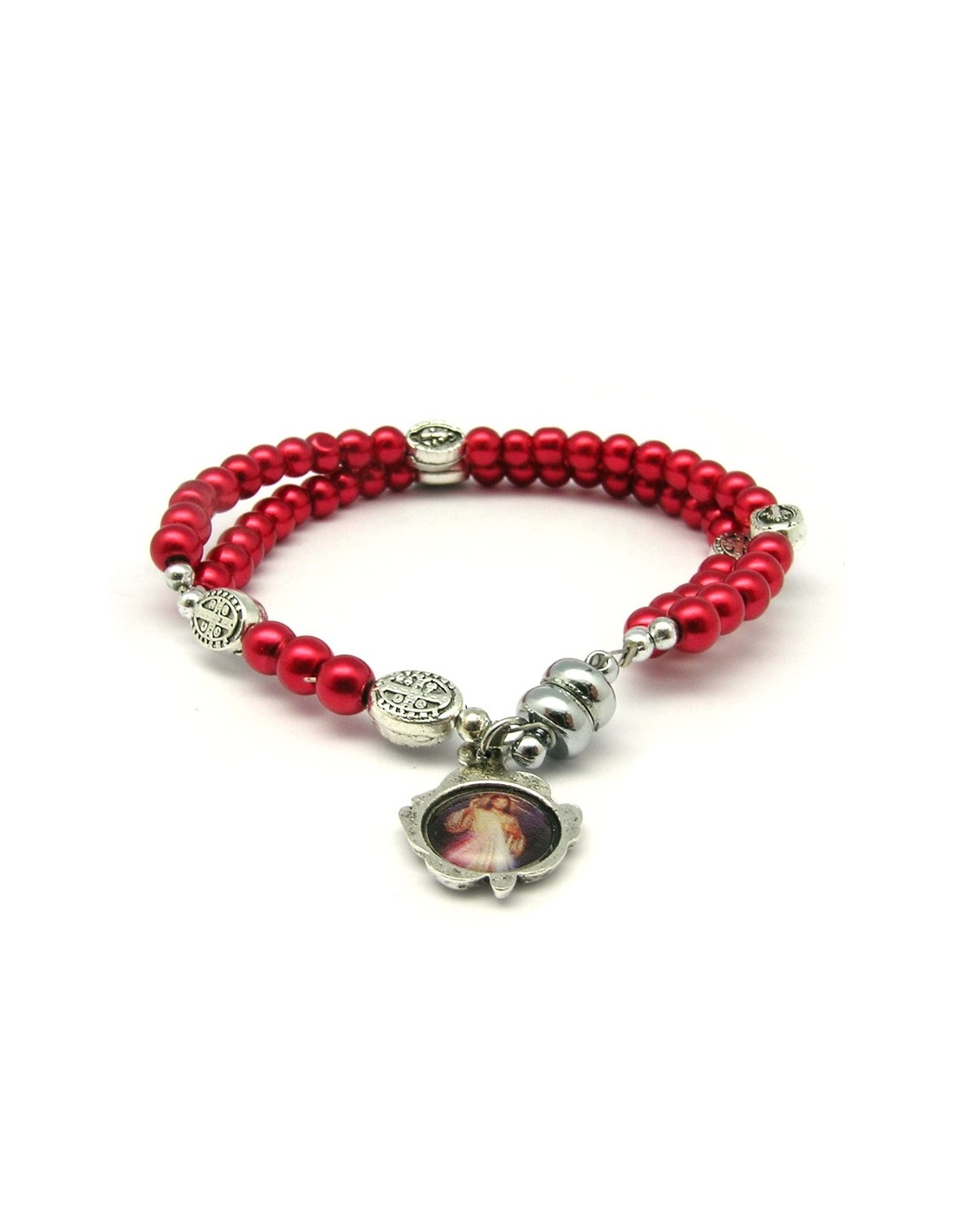Pulsera Rosario Cristal Liso Rojo 5Mm Paters Medalla San Benito Cierre Magnetico