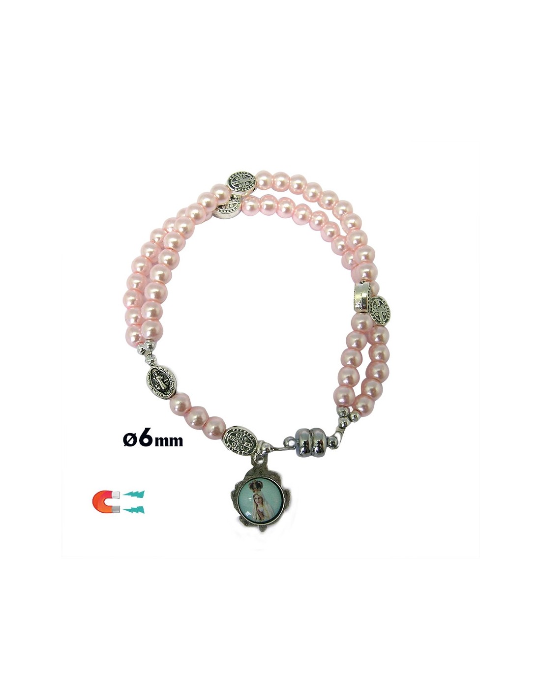 Pulsera Rosario Cristal Liso Rosa 5Mm Paters Medalla San Benito Cierre Magnetico