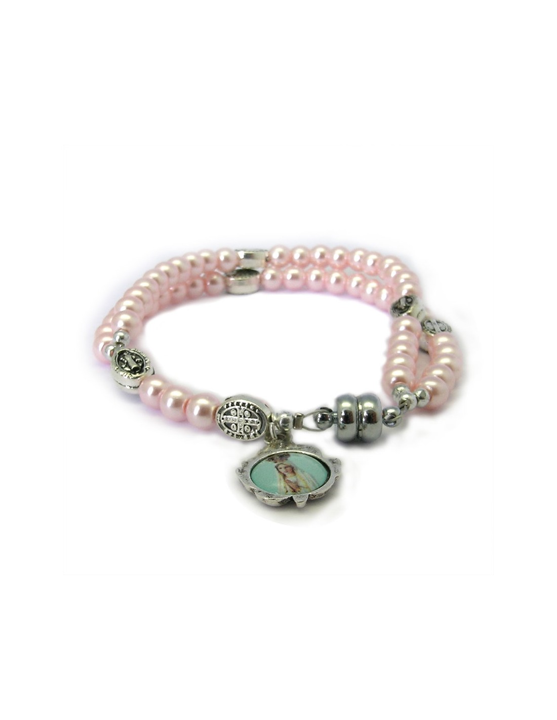 Pulsera Rosario Cristal Liso Rosa 5Mm Paters Medalla San Benito Cierre Magnetico