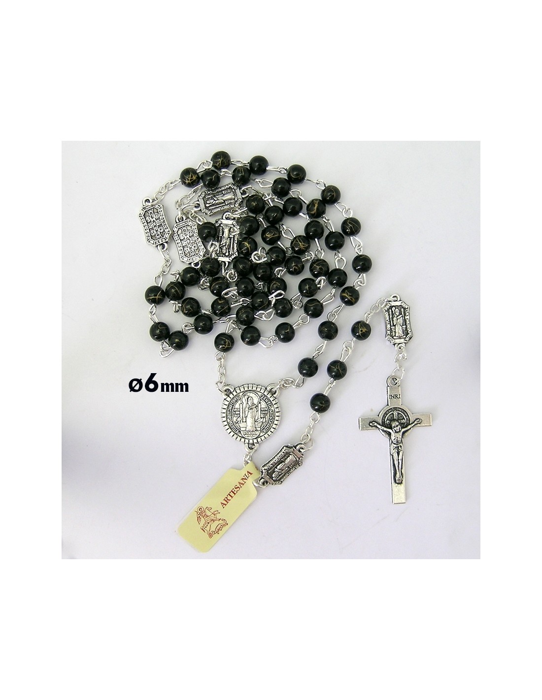 Rosario Plastico San Benito 6Mm Negro Con Hilos Dorados