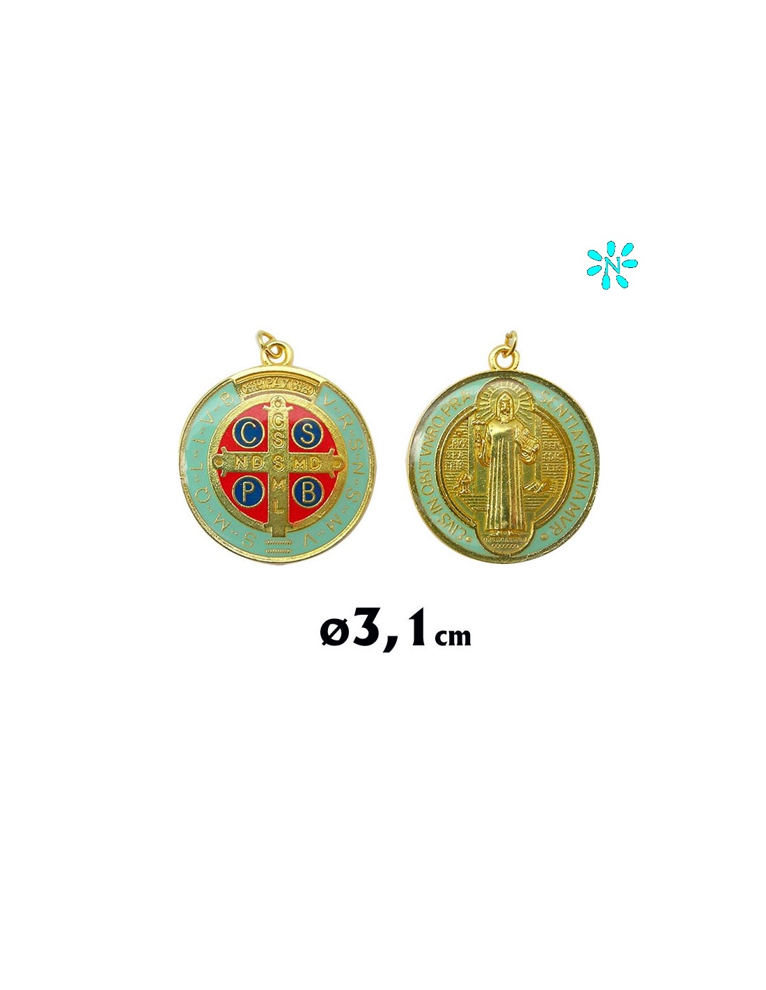Medalla Metal San Benito A Color 31Mm Dorada Con Esmalte Cristal A Dos Caras